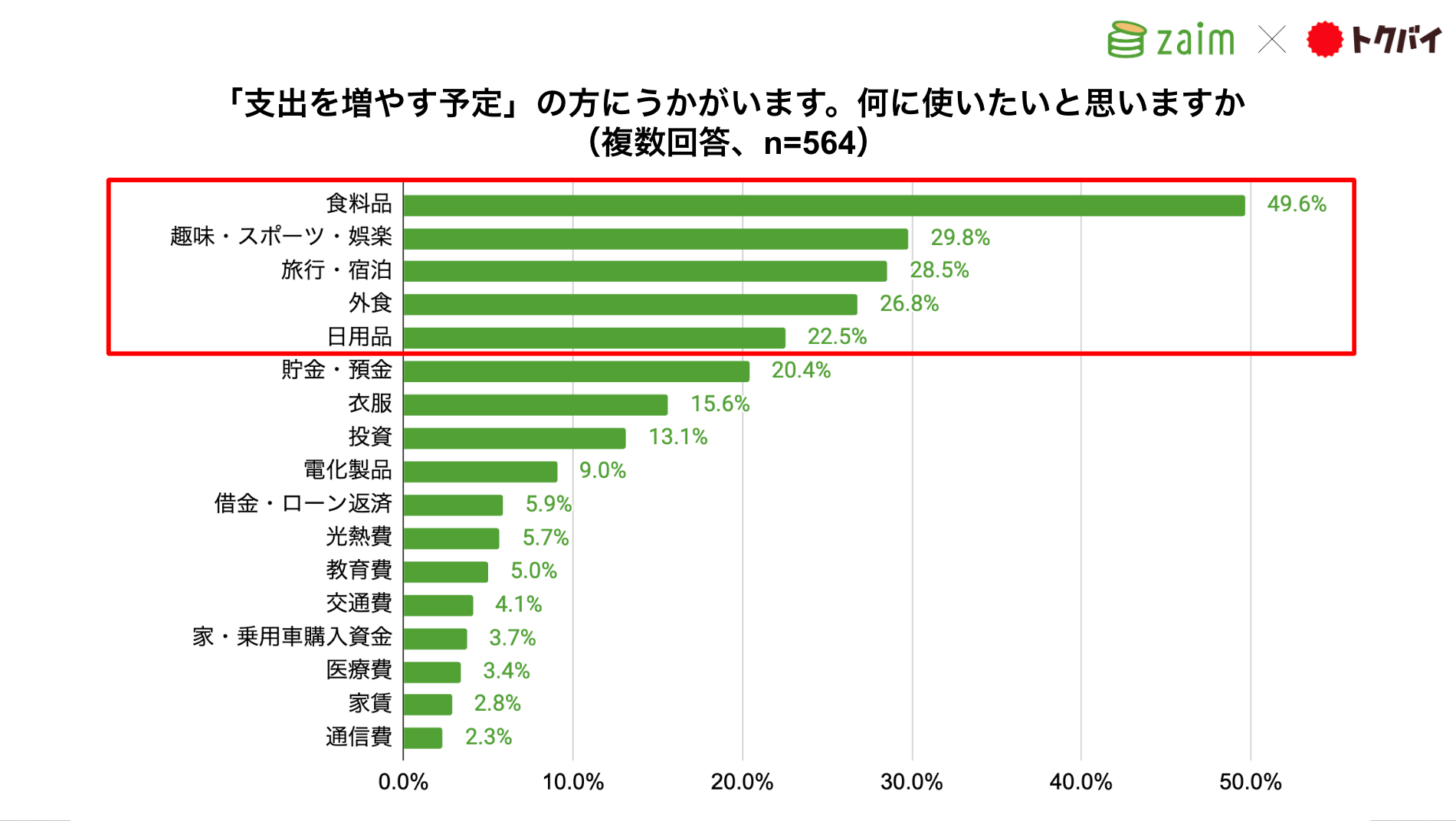 一方で、「大幅に支出を増やしたい」0.9%、「少し支出を増やしたい」5.7%と回答した人に、支出する予定の項目について聞いたところ、約5割が「食料品」と回答し、次いで「趣味・スポーツ・娯楽」が29.8%、「旅行・宿泊」が28.5%、「外食」が26.8%、「日用品」が22.5%という結果となりました。値上がりの目立つ食料品といった生活費への支出に加え、趣味や旅行といった楽しみへの支出を計画している人が多いことがわかります。