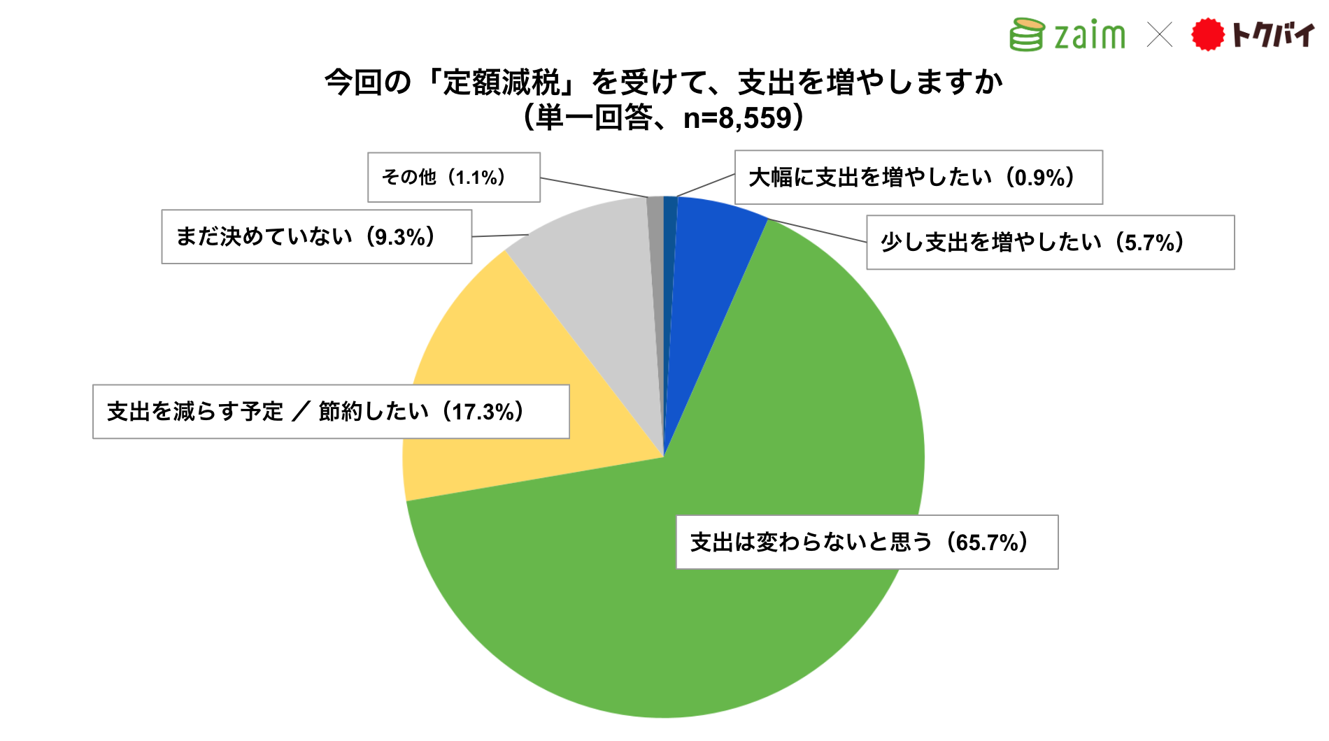 続いて、今回の「定額減税」を受けて支出を増やすかどうかを尋ねたところ、6割以上が「支出は変わらないと思う」と回答しました。さらに、約2割の回答者は減税を受けてもなお「支出を減らす予定/節約したい」と回答しました。
