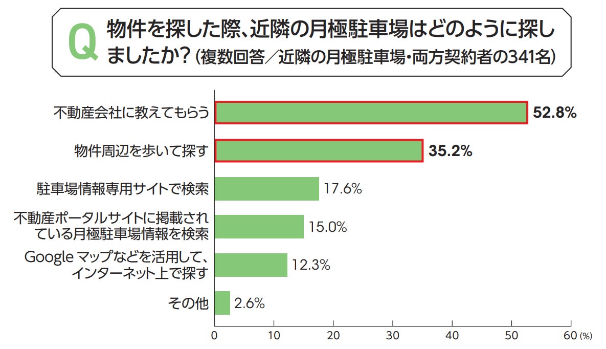 次いで多かったのは「物件周辺を歩いて探す」で、「駐車場情報専用サイトで検索」や「不動産ポータルサイトに掲載されている月極駐車場情報を検索」と約10ポイント差を付けました。実際に歩いて、住まいからの距離と駐車場の料金などを考慮し探す人が一定数いることが分かりました。