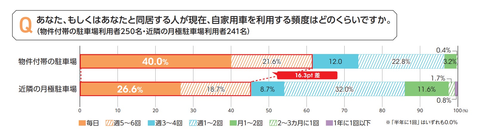 自家用車を「毎日」「週5~6回」利用する人は、物件付帯で61.6%、近隣の月極駐車場で45.3%と16.3ポイントの差がありました。利用頻度が高いほど、住まいからの距離の近さが重要視されています。