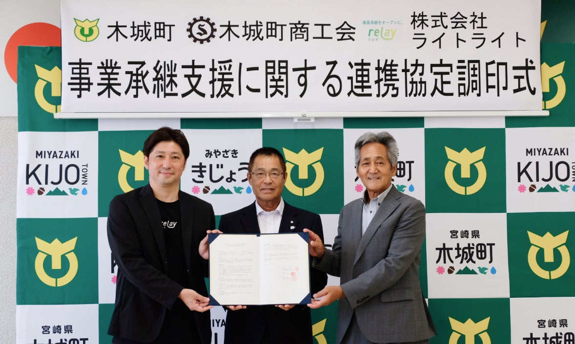事業承継マッチングプラットフォーム「relay(リレイ)」を運営する株式会社ライトライト(宮崎県宮崎市 / 代表取締役:齋藤 隆太 / 以下、ライトライト)は、このたび宮崎県木城町(宮崎県木城町 / 木城町長:半渡 英俊)、木城町商工会(木城町商工会長:長友 道泰)と事業承継支援に関する連携協定を締結したことをお知らせいたします。