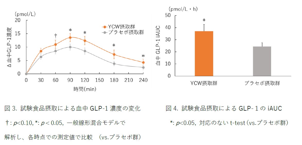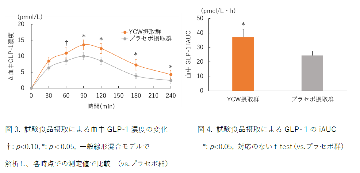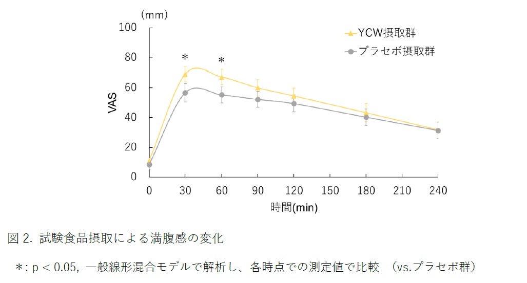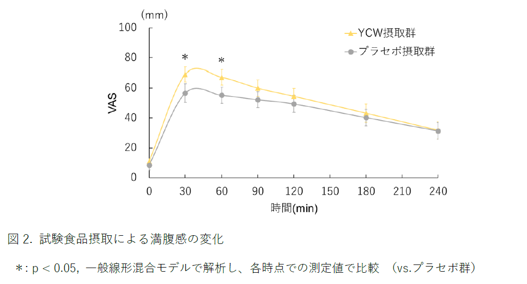 YCW摂取群はプラセボ摂取群と比べて摂取30分から60分までの満腹感を増強することが明らかとなりました(図2)。