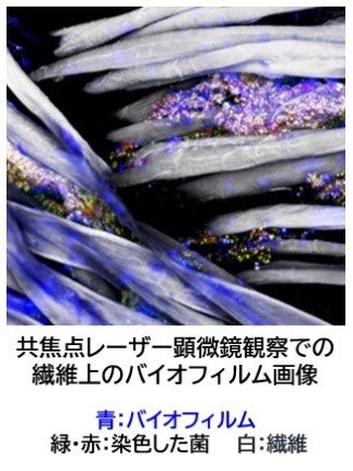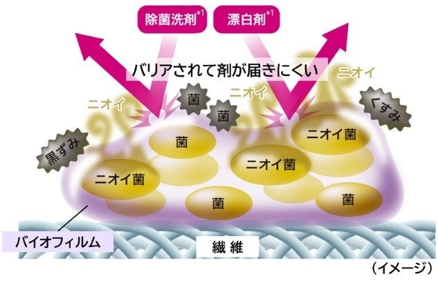 花王は、浴室のピンク汚れのように日常に潜んで害悪をもたらす「バイオフィルム*3」が繊維にも存在することを突きとめ、研究・開発を重ねてまいりました。このたび、嫌なニオイと「バイオフィルム*3」が関係することの可視化に成功しました。これにより、嫌なニオイ戻りを解決するためには、「バイオフィルム*3」を除去することが有効であることを再確認しました。また、「バイオフィルム*3」は非常に耐性が強く、漂白剤・除菌洗剤*1に加えて、煮沸*2をしても落とせないことも明らかになりました。