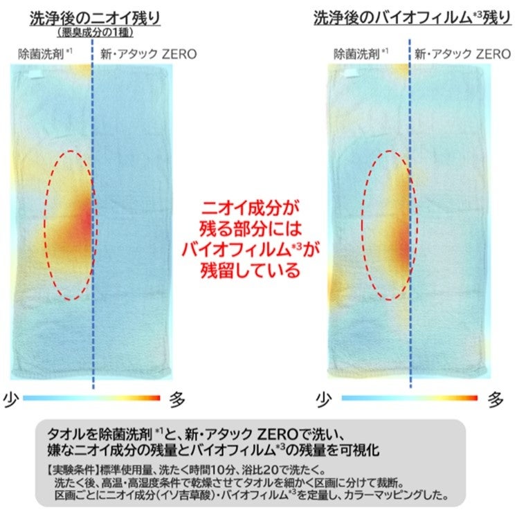 除菌洗剤*1で洗たくしたタオルでは嫌なニオイ成分が残っている部分に「バイオフィルム*3」が多く残留している一方で、「バイオフィルム*3」の除去性能が格段に向上*6した新「アタック ZERO」で洗たくした後は、嫌なニオイ成分も「バイオフィルム*3」も少なく、消臭できていることを確認できています。