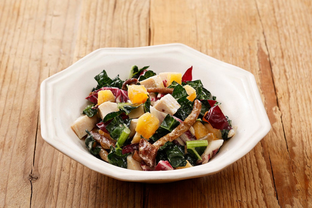 博多すぎたけ、富有柿、カーボロネロと蒸し鶏のサラダ 九州醤油マヨネーズ和え