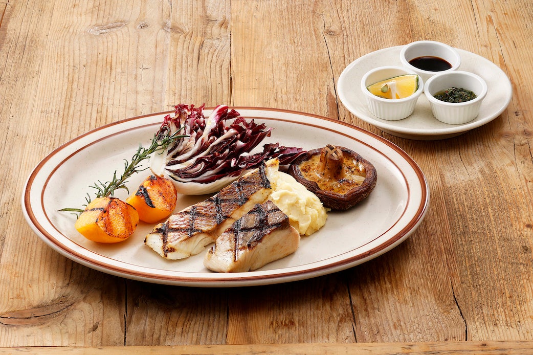 鹿児島県産黒毛和牛・熊本県産潮うしおぶりと長崎県産真鯛のグリルの付け合わせには大分県産ステーキしいたけ、福岡県産富有柿や鹿児島県産ラディッキオ等を添えました。九州を代表する食材をふんだんに盛り込んだ一皿です。