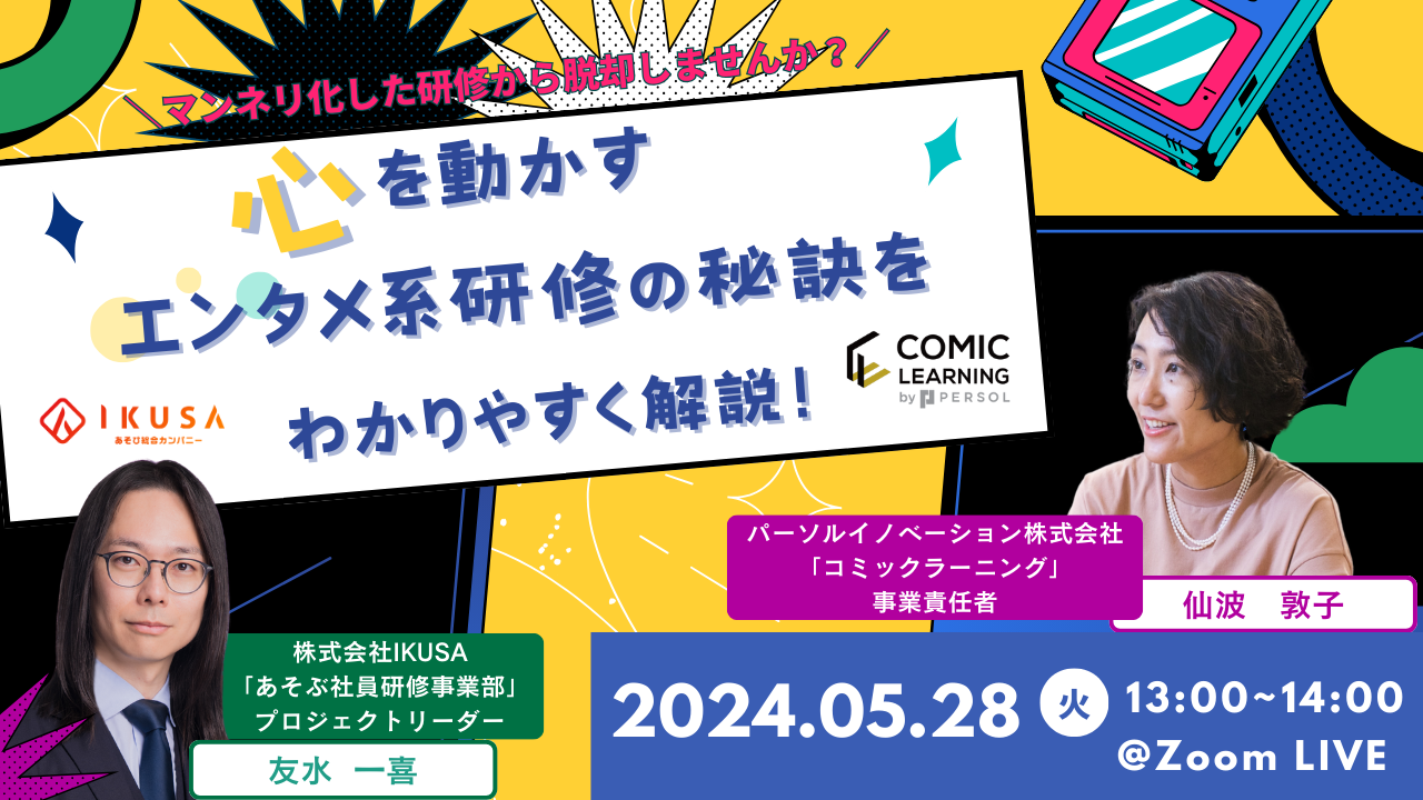 【日時:2024年5月28日(火)13:00~14:00】コミック教材を活用した研修サービス『コミックラーニング』、あそびで社会課題の解決を図る株式会社IKUSAと共同オンラインセミナーを開催!