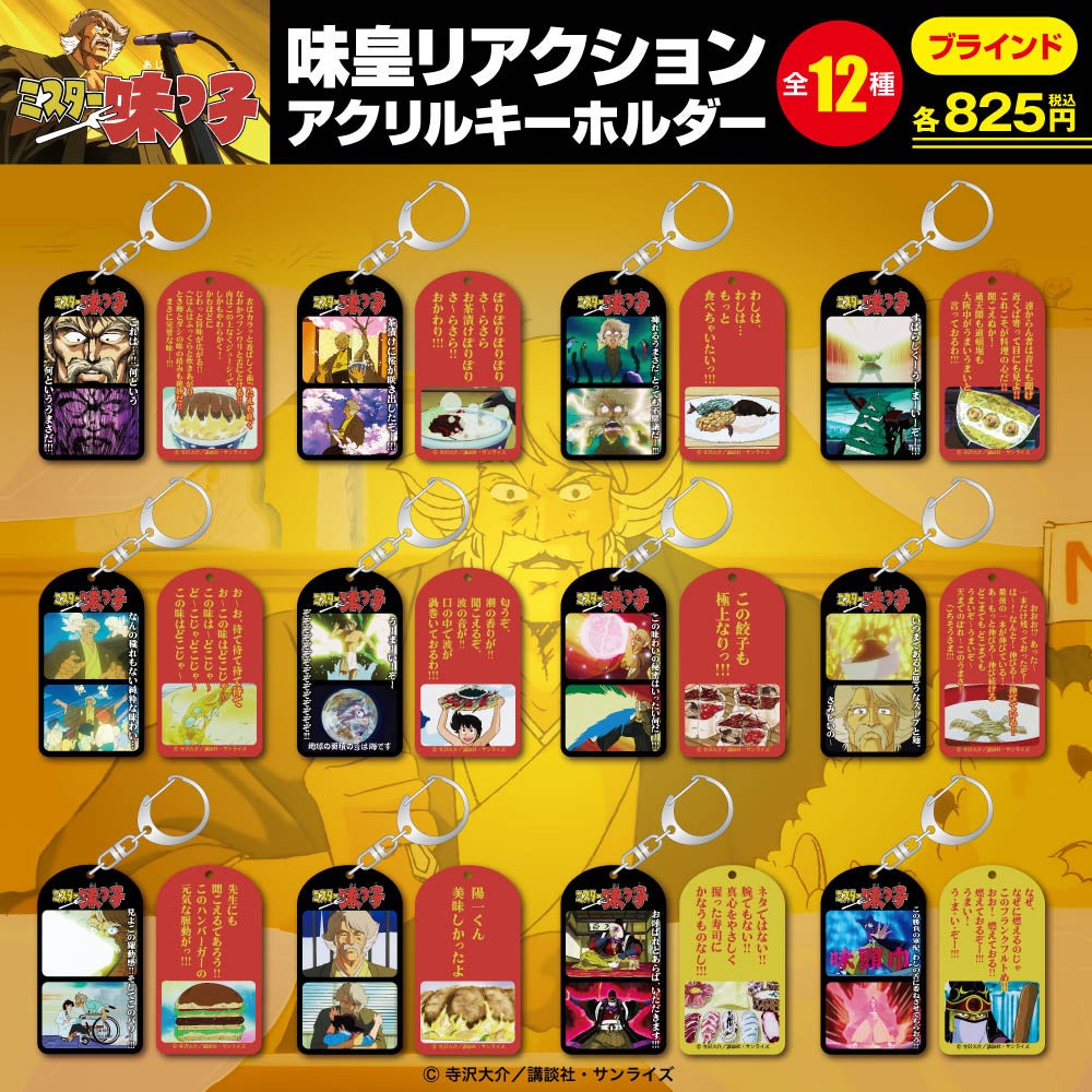 アニメ版「ミスター味っ子」といえばはずせない人気キャラ、味皇様の名シーン、名ゼリフ、名リアクションを集めた極上アクリルキーホルダーが全12種登場!各話ごとに味皇の豊かな表情と名言を両面に記してストーリー性あふれる、ファンにはたまらない三つ星級の逸品だ!
