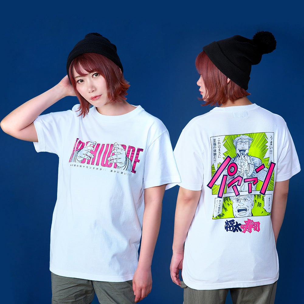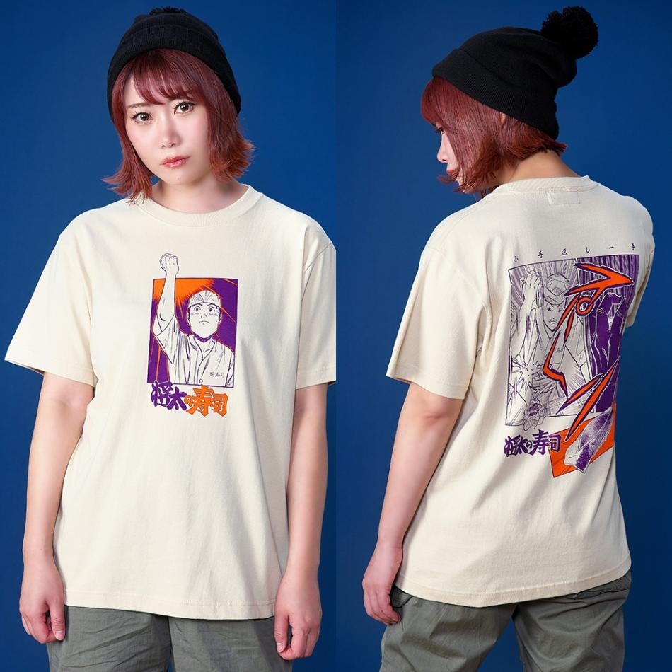 寿司職人の基本とも言える握りの工程は「本手返し七手」。しかし握りを極めた者がたどり着く究極の握りは「小手返し一手」!片手に怪我をし、右手のみしか使えなくなった将太がここ一番で見せた必殺の小手返し一手を前後にプリントした名場面Tシャツです。
