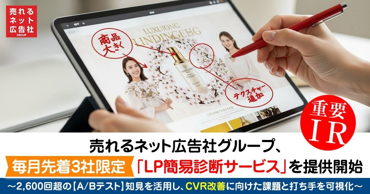 売れるネット広告社グループ株式会社(本社:福岡県福岡市、代表取締役社長 CEO:植木原宗平、東証グロース市場:証券コード9235、以下 売れるネット広告社グループ)の連結子会社である売れるネット広告社株式会社は、このたび、当社グループが蓄積してきた2,600回超の【A/Bテスト】実績に基づく知見を活用した新サービスとして、「LP簡易診断サービス(通称:LPの赤ペン先生)」を【毎月先着3社限定】で提供開始することをお知らせいたします。