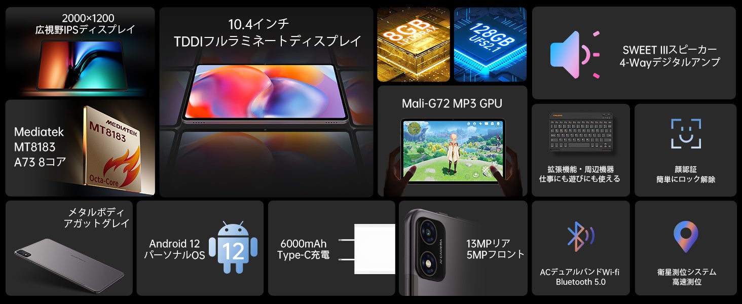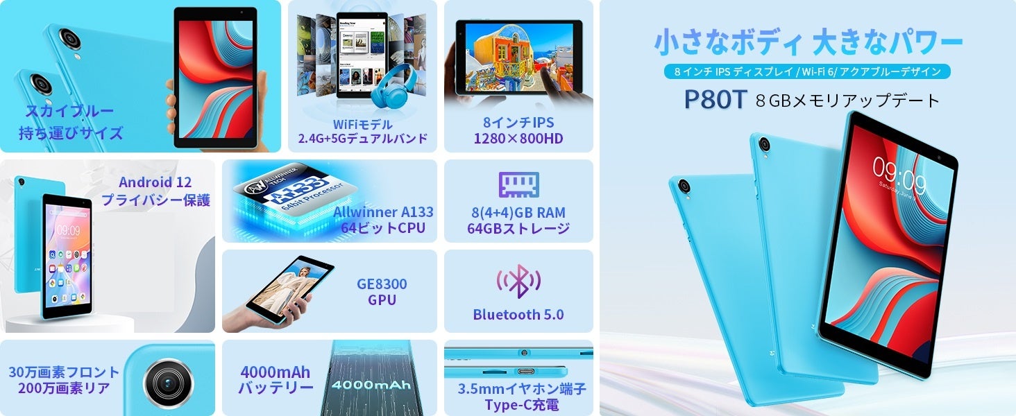 8インチ / Android 12 / 8GB(4GB+4GB拡張) RAM+64GB ROM+1TB拡張 / HD IPSディスプレイ / WIFIモデル / 3.5mmヘッドホン / 児童守護 / 技適認証取得