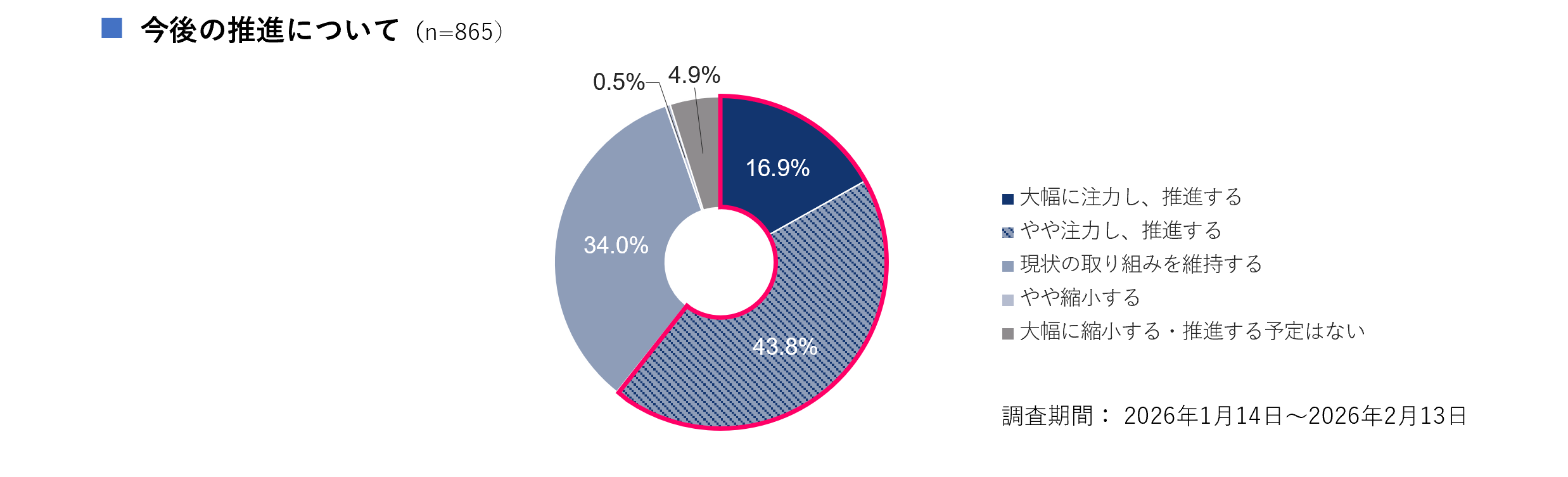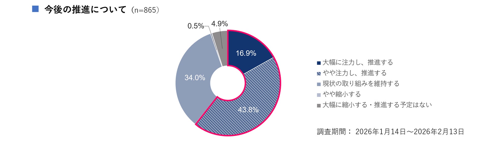 DXに取り組んでいる企業に対し、今後の推進について伺ったところ、「大幅に注力し、推進する」が16.9%、「やや注力し、推進する」が43.8%、「現状の取り組みを維持する」が34.0%という結果になりました 。現状維持を含めると9割を超える企業が、今後もDXを継続する意思を示していることが明らかになっています 。一方で、「やや縮小する」や「大幅に縮小する・推進する予定はない」といった回答は少数にとどまりました 。