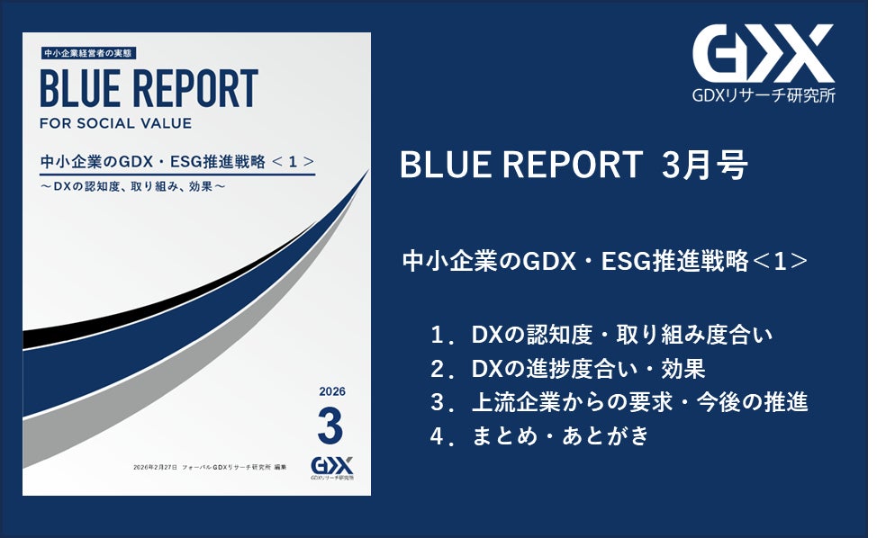 『「新しいあたりまえ」で、新しい世界を創るFORVAL』を理念に掲げる、次世代経営コンサルタント集団である株式会社フォーバル(本社:東京都渋谷区、代表取締役社長:中島 將典、以下「フォーバル」)が運営するフォーバル GDXリサーチ研究所は、中小企業向けの様々な支援に関する認知・理解状況や活用実態などについて調査した「BLUE REPORT 3月号」を2026年2月27日(金)に発行いたします。