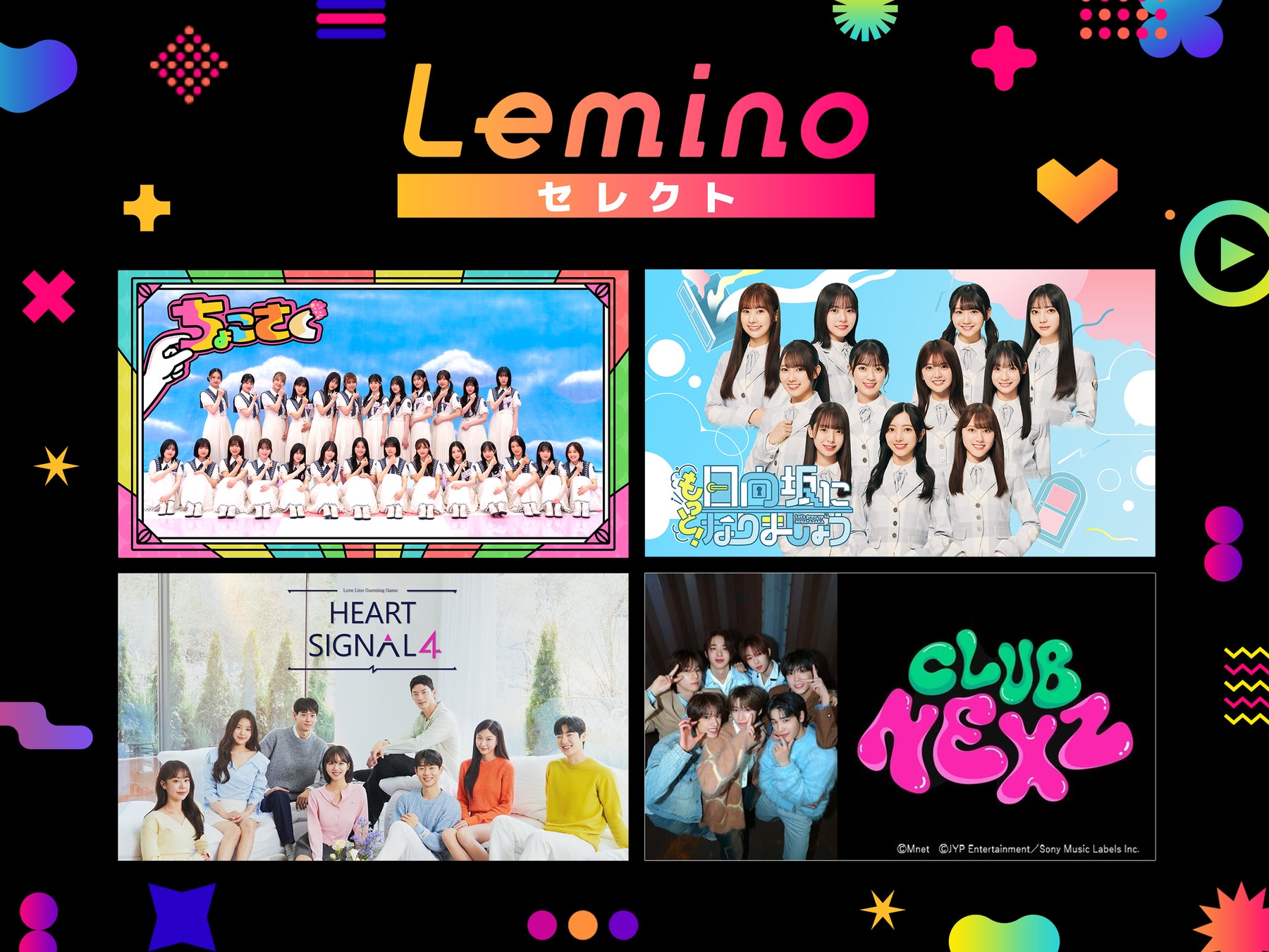 「Leminoセレクト」は、「Lemino」で提供中の作品から[オリジナル/韓流/ファンユース/スポーツ]ジャンルの内、厳選した作品で提供を開始いたします。日本/韓国のアイドル作品から話題の韓流ドラマまで特定のジャンルのコンテンツを月額550円(税込)にてお楽しみいただけます。「Leminoセレクト」開始時には、『もっと!日向坂になりましょう』、『ちょこさく』、『HEART SIGNAL4』、『デビュー準備クラス <CLUB NEXZ>』などのコンテンツを配信しています。