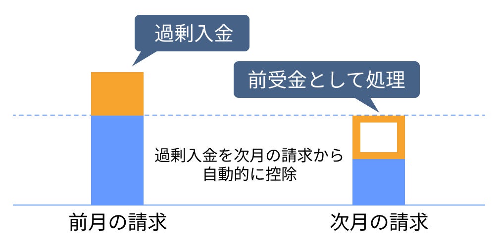 本機能により、過剰入金を「繰越待ち」として登録することで、次回請求時に自動的に控除され、差引後の金額で請求書が発行されます。過剰分は前受金として処理され、仕訳データが自動生成されるため、経理処理の手間を軽減できます。