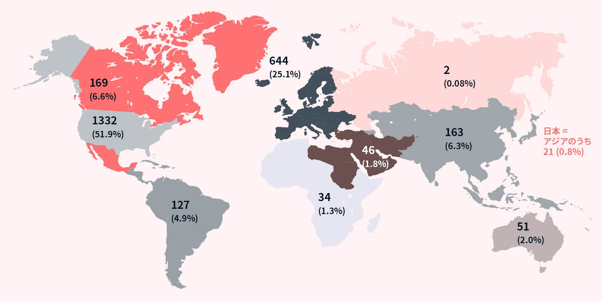 2024年上半期にランサムウェアのリークサイトに掲載された被害者数は2,568。地域別ではアメリカが1位で1,332件 (52%)。次点はヨーロッパの644件 (25.1%)。日本は21件で0.8%となっている。