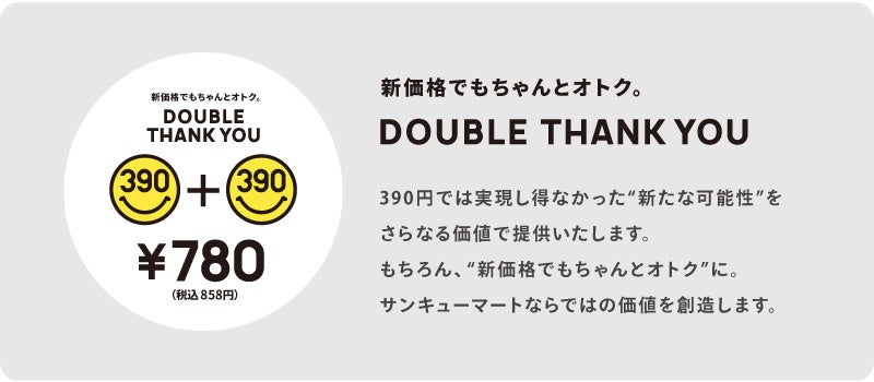 今回初めて導入したダブルサンキュー価格(税抜390円×2=780円)で目指す「新たな可能性と価値の提供」を一人でも多くのお客様に届けられるよう、サンキューマートは今後も努力を続けます。