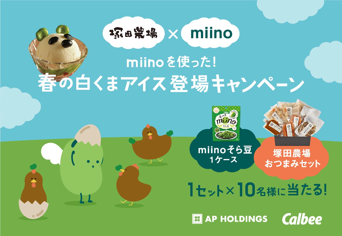 株式会社エー・ピーホールディングス(本社:東京都豊島区、代表取締役 社長執行役員CEO:米山久)が展開する塚田農場(「宮崎県日南市 塚田農場」、「宮崎県日向市 塚田農場」、「鹿児島県霧島市 塚田農場」)の季節限定メニューで提供する「春の白くまアイス ピスタチオといちご」は、カルビー株式会社(本社:東京都千代田区、代表取締役社長:伊藤秀二)の「miinoそら豆しお味」を耳に使い、萌黄色が映える春らしさ満載のかわいいルックスの白くまアイスとなりました。このコラボレーションを記念して、4月22日(金)より、塚田農場の炭火焼やカルビーの商品が当たるSNSキャンペーンと、塚田農場をご利用のお客様に「miinoそら豆しお味」現品のプレゼント企画を実施いたします。