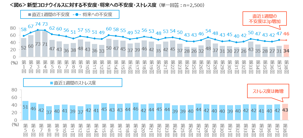 定点指標の「直近1週間の不安度」は3p増の34%、「将来に対する不安度」は微減の46%である。「直近1週間のストレス度」は、微増の42%であった。<図6>