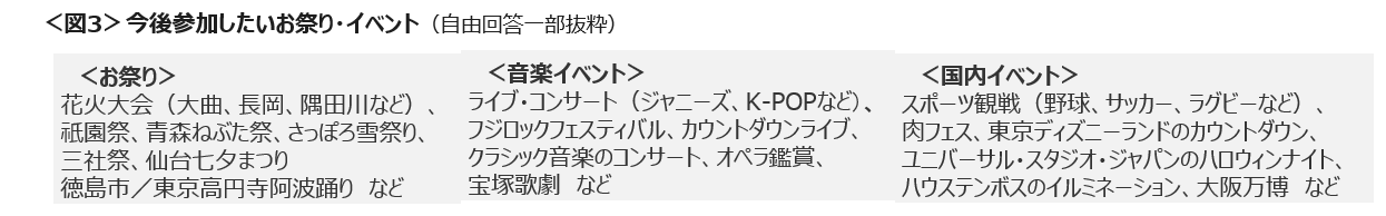 今後参加したいお祭りやイベントを自由回答にて確認した。お祭りでは、開催を見合わせているものも含め、「花火大会」や「祇園祭」など全国的に有名なお祭りが具体的にあがった。また、「東京ディズニーランド」「ユニバーサル・スタジオ・ジャパン」「ハウステンボス」の限定イベントや、2025年に開催する「大阪万博」の声もあった。<図3>