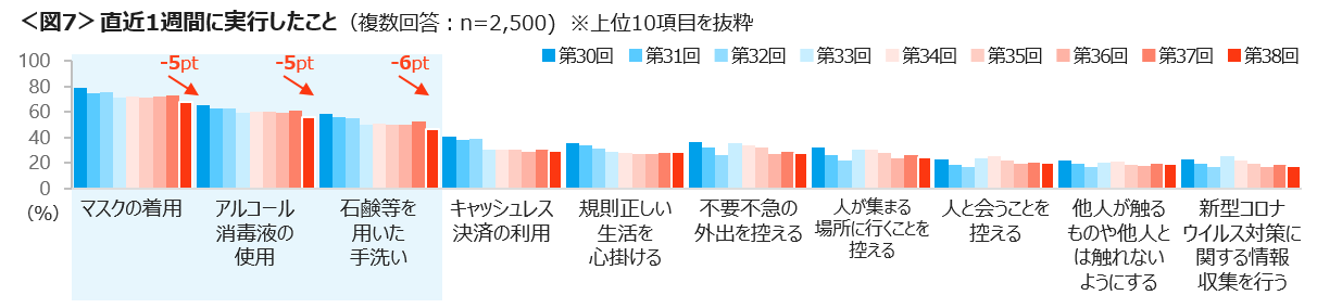 直近1週間で行ったことでは、感染症対策の「マスクの着用」「アルコール消毒の使用」「石鹸などを用いた手洗い」が5~6p低下している。<図7>