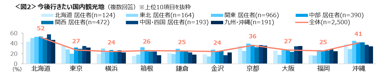 国内21の観光地名を提示して行きたい場所を聴取した。「北海道」52%、「沖縄」41%、「京都」36%が人気の観光地。居住エリアでみると、「北海道」は中国・四国居住者で人気が高い。「大阪」は、中国・四国居住者と九州・沖縄居住者、「箱根」は関東居住者と距離的に近いエリア居住者で人気が高い。<図2>