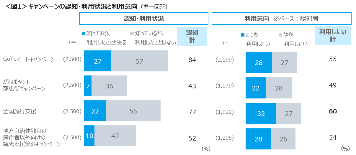国や自治体で行っているキャンペーンについて確認をした。認知率や利用率が高いのは、”GoToイート”と”全国旅行支援”である。利用意向は、いずれのキャンペーンも半数の人が「利用したい」としている。最も意向が高いのは”全国旅行支援”であり、「とても利用したい」が33%、「やや利用したい」27%と合わせて6割の人で意向がある。<図1>