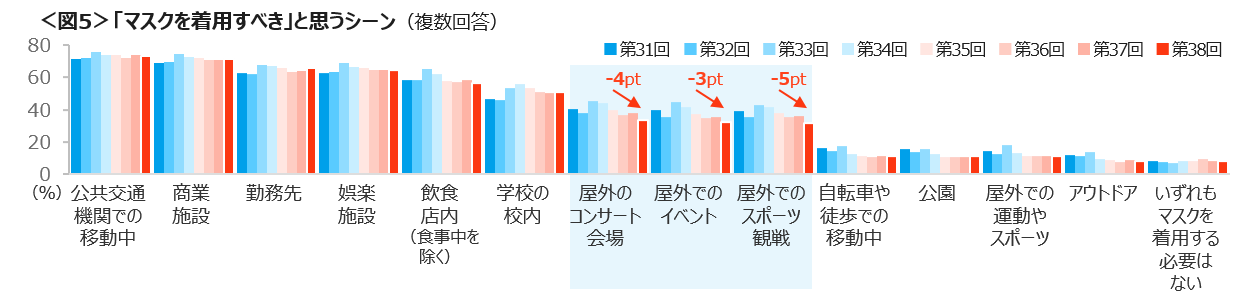 一方、マスクを着用すべきシーンは、「屋外のコンサート会場」「屋外でのイベント」「屋外でのスポーツ観戦」が3~5p低下した。屋外であれば、集客イベント時のマスク着用は不要と思う人が増えてきている様子が見てとれる。<図5>