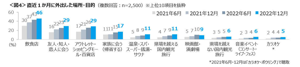 直近1か月の外出先は、「飲食店」「友人・知人・恋人に会う」「アウトレット・ショッピングモール・百貨店」が上位であり、2021年6月より右上がりに増加している。<図4>