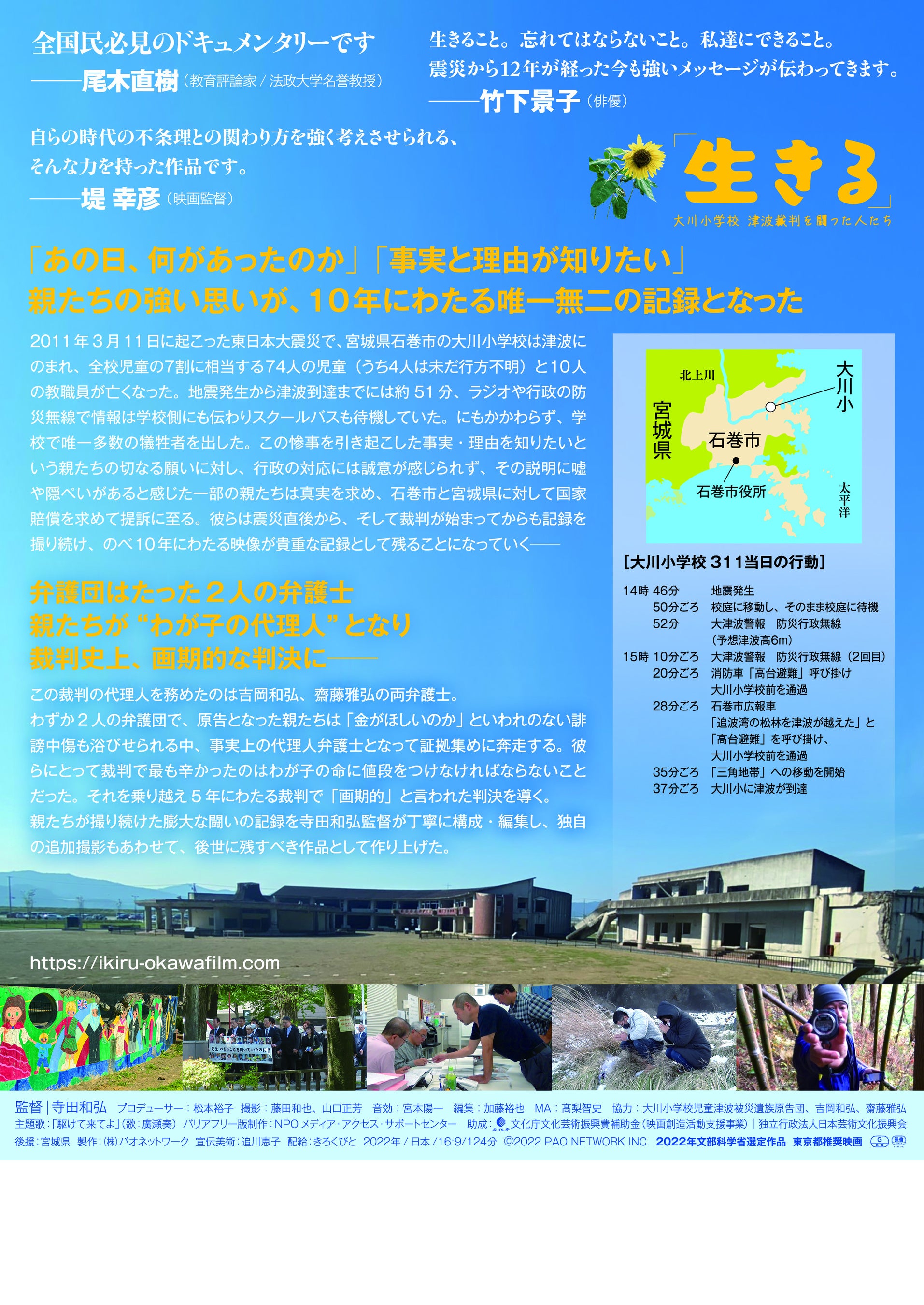 後半は、ドキュメンタリー『「生きる」大川小学校 津波裁判を闘った人たち』を上映します。宮城県の津波被害で児童74人と教職員10人が亡くなった大川小学校の避難の経緯と、その責任を問う裁判が描かれています。映画のプロデューサー松本裕子さんの話も聞き、小さな命が遺した学校防災の教訓や子どもたちを失った親たちの思いを紹介します。