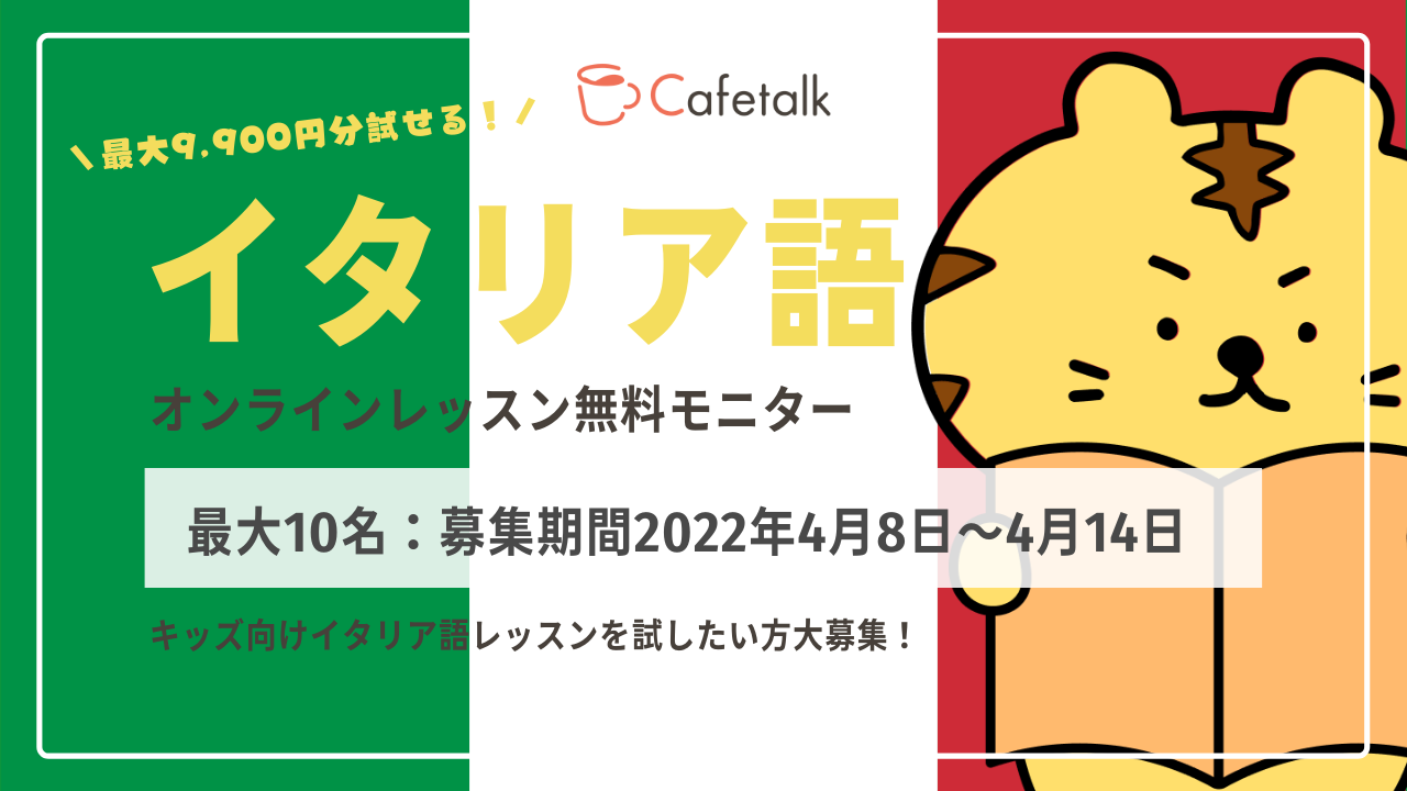対象:オンラインで受講するイタリア語レッスンにご興味がある方、お子様の習い事にイタリア語を検討されている方。カフェトークのオンラインレッスンを試してみたい方