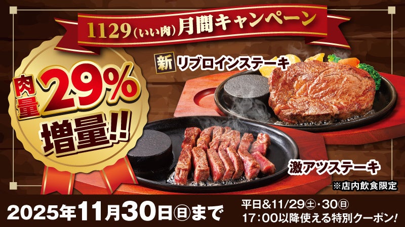 株式会社アークミール(本社:埼玉県さいたま市、代表取締役社長:柳 先)が運営するステーキレストラン「ステーキのどん」では、2025年11月を“いい肉月間”として、平日及び11月29日(土)、30日(日)の17時以降にご利用いただける「29%増量クーポン」を配布いたします。