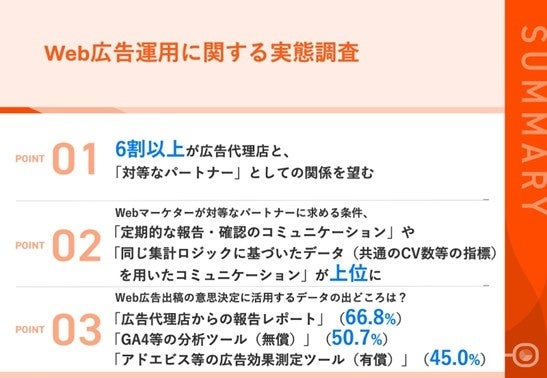 Web広告出稿の意思決定においては、66.8%の企業が広告代理店からの報告レポートを活用しているものの、過半数近い企業が分析ツールや広告効果測定ツールを利用していることがわかりました。さらに、広告運用の改善において重要視する要素としては「顧客の購買行動の可視化」(65.9%)、「正確なCVデータの計測」(49.8%)が上位に挙げられています。本調査結果から、企業側は広告代理店からの報告レポートだけでなく分析ツールを用いることで、報告レポート以上のデータ分析を実施したうえで意思決定をしていることが明らかになりました。広告代理店との円滑なコミュニケーションを強化しながらも、自社においては、高精度なデータ計測・分析を可能とする環境を構築することが広告運用における成果の最大化につながるのではないでしょうか。