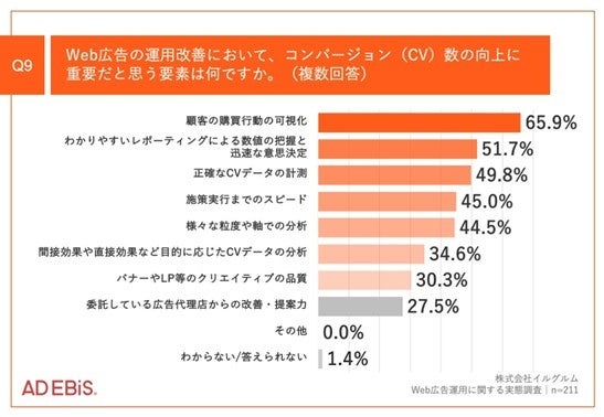 「Q9.Web広告の運用改善において、コンバージョン(CV)数の向上に重要だと思う要素は何ですか。(複数回答)」(n=211)と質問したところ、「顧客の購買行動の可視化」が65.9%、「わかりやすいレポーティングによる数値の把握と迅速な意思決定」が51.7%、「正確なCVデータの計測」が49.8%という回答となりました。