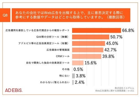 「Q8.あなたの会社ではWeb広告を出稿する上で、主に意思決定する際に参考にする数値やデータはどこから取得していますか。(複数回答)」(n=211)と質問したところ、「広告運用を委託している広告代理店からの報告レポート」が66.8%、「GA4等の分析ツール(無償)」が50.7%、「アドエビス等の広告効果測定ツール(有償)」が45.0%という回答となりました。