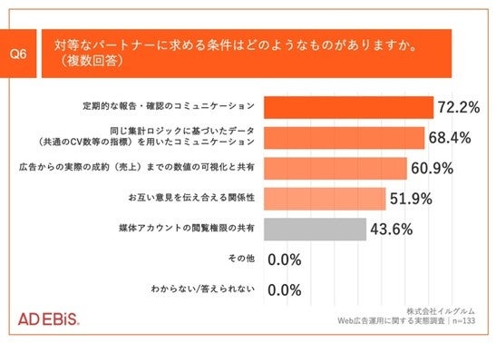 Q5で「対等なパートナー」と回答した方に、「Q6.対等なパートナーに求める条件はどのようなものがありますか。(複数回答)」(n=133)と質問したところ、「定期的な報告・確認のコミュニケーション」が72.2%、「同じ集計ロジックに基づいたデータ(共通のCV数等の指標)を用いたコミュニケーション」が68.4%、「広告からの実際の成約(売上)までの数値の可視化と共有」が60.9%という回答となりました。