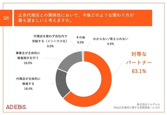 「Q5.広告代理店との関係性において、今後どのような関わり方が最も望ましいと考えますか。」(n=211)と質問したところ、「対等なパートナー」が63.1%という回答となりました。