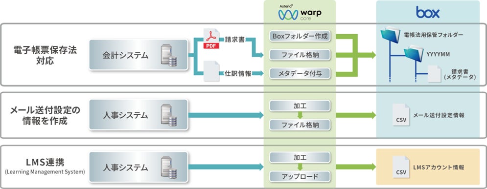 これらの懸念を解消しながら電子帳簿保存法への対応をスムーズに進めるために、既に導入していたコンテンツクラウド「Box」や既存の会計システムを基軸にしたソリューションの構築を決定。また、Boxとの連携実績が豊富なWarp Coreを採用し、これらのシステムやサービスの連携をノーコードで構築しました。これにより、会計システムからBoxに毎月の請求書などの電子帳簿を自動で集約・格納するデータ連携基盤を約2ヶ月で構築し、電子帳簿保存法への対応を短期間かつ低コストで実現しました。