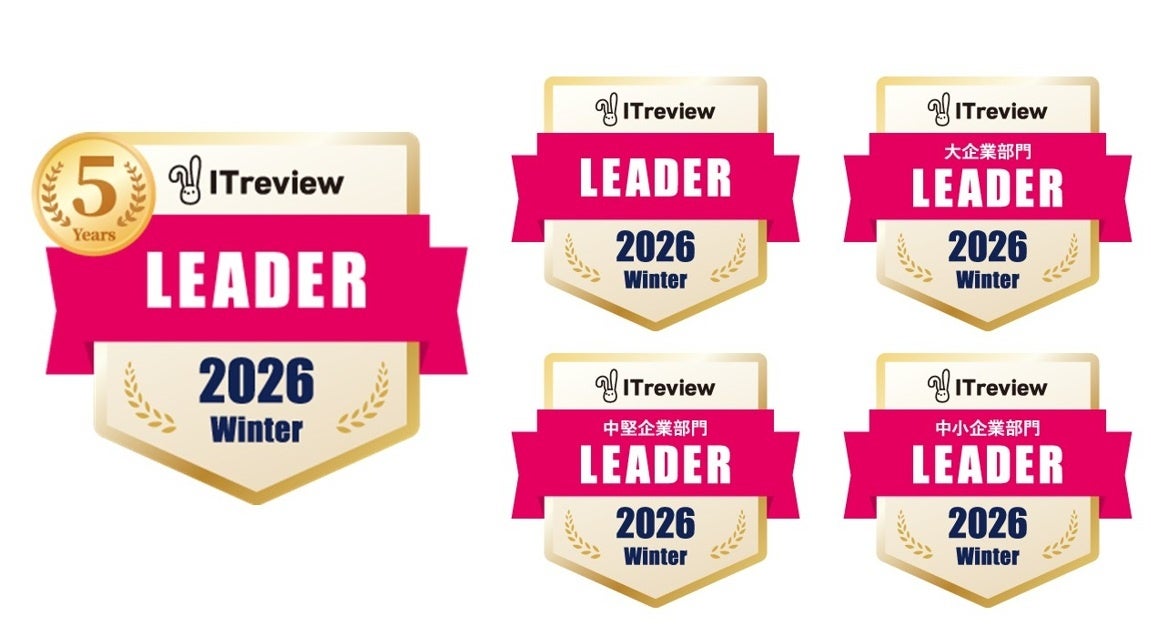 1月に発表された「ITreview Grid Award 2026 Winter」では、ITreviewに集まった約15.1万件のレビューをもとに、顧客満足度と認知度の双方が優れた製品を「Leader」として表彰、バッジが発行されています。ITreviewのLeaderは多くの利用者から支持を得ている証であり、大企業や中堅企業、中小企業といった各企業規模のユーザーから高評価だった場合にも、大企業部門のLeader、中小企業部門のLeaderなどと称号が与えられています。
