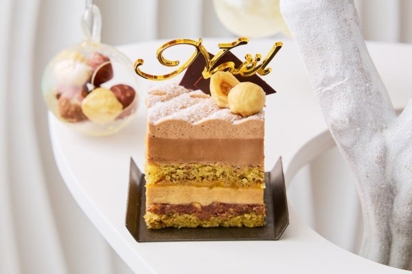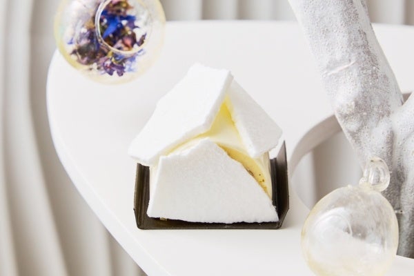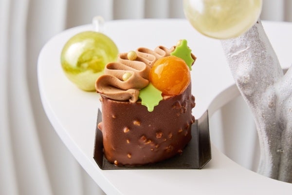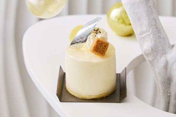 スミレの華やかな香りが広がるしっとりとしたバニラ風味の生地に、香ばしいヘーゼルナッツのクルスティアン(※注1)、爽やかな柚子のクリーム、洋梨とカモミールのジュレを忍ばせました。ムースにもスミレの香りを加え、洋梨の甘さ、柑橘の爽やかさとあわさることで、余韻の残る奥深い味わいをお楽しみ頂けます。ホワイトクリスマスを感じる真っ白なフォルムに仕上げました。
