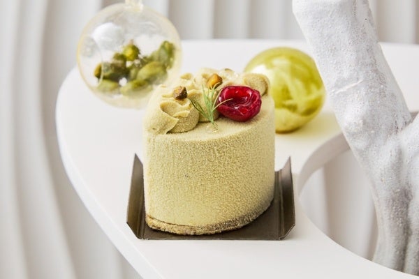 ローストし香ばしさを引き出したピスタチオのクルスティアン(※注1)、お酒が効いたグリオット風味のババ(※注2)、そこに酸味のあるグリオットのコンフィチュールを入れ、濃厚でナッティな香りのピスタチオのクリームで全体を包みました。ババには香ばしいピスタチオとグリオットの酸味を重ね、見た目にも緑と赤の配色をしクリスマスらしさを感じる一品です。