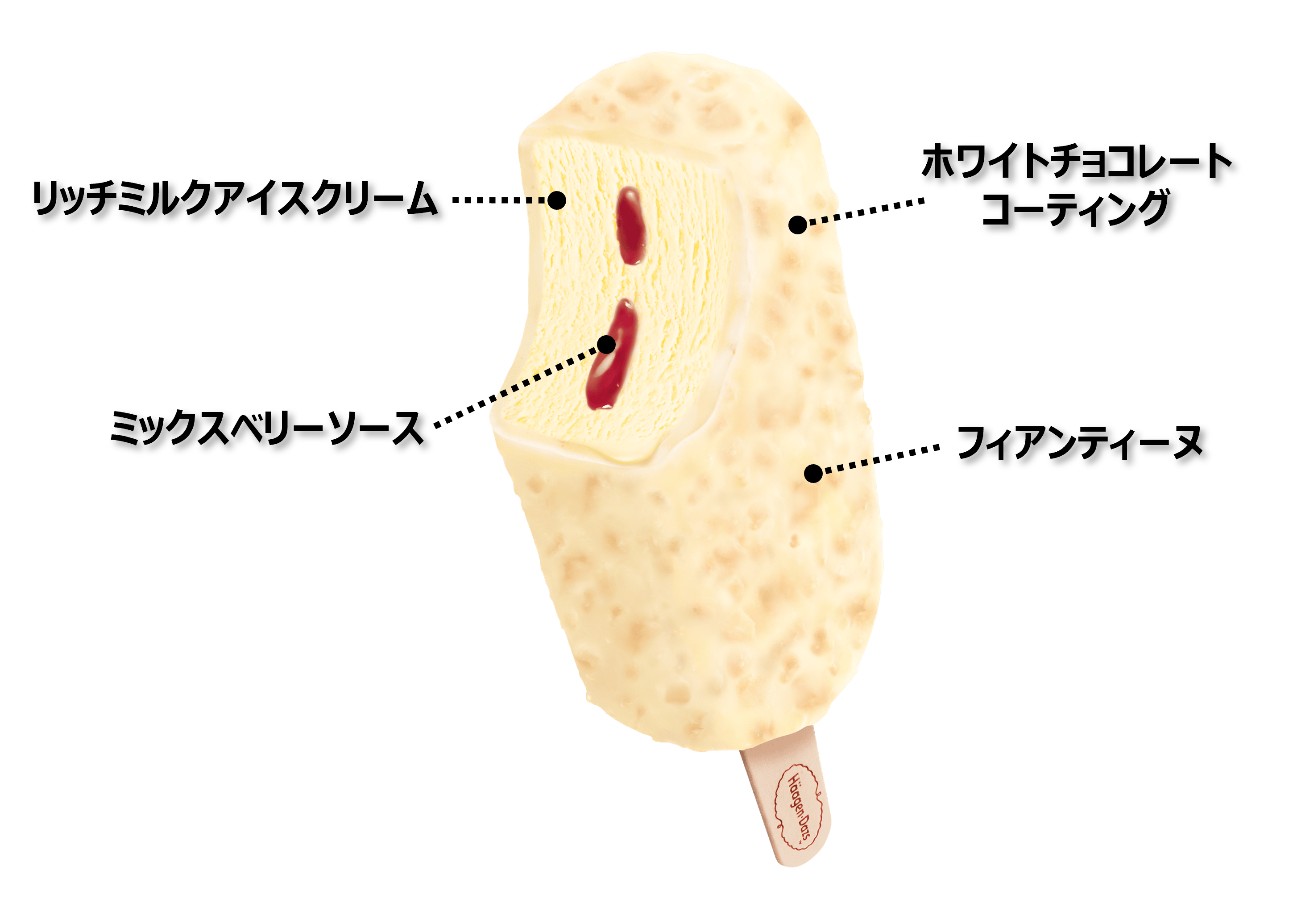 濃厚な味わいのリッチミルクアイスクリームの中に、甘酸っぱいミックスベリーソースを加え、サクサク食感のフィアンティーヌ※1入りのホワイトチョコレートコーティングで包みました。