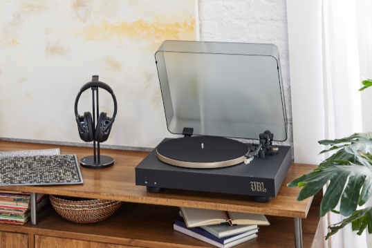 「Spinner BT」は、キャビネットの前面に、エッジにゴールドをあしらったJBLロゴをあつらえ、それにマッチングするように同じくゴールドの塗装が施されたアルミニウム・ダイキャストのプラッターを採用。カートリッジ交換にも対応するアルミニウム製トーンアームを採用した本格的な仕様を施しつつ、リビングのアクセントとなるデザインとしてまとめ上げています。