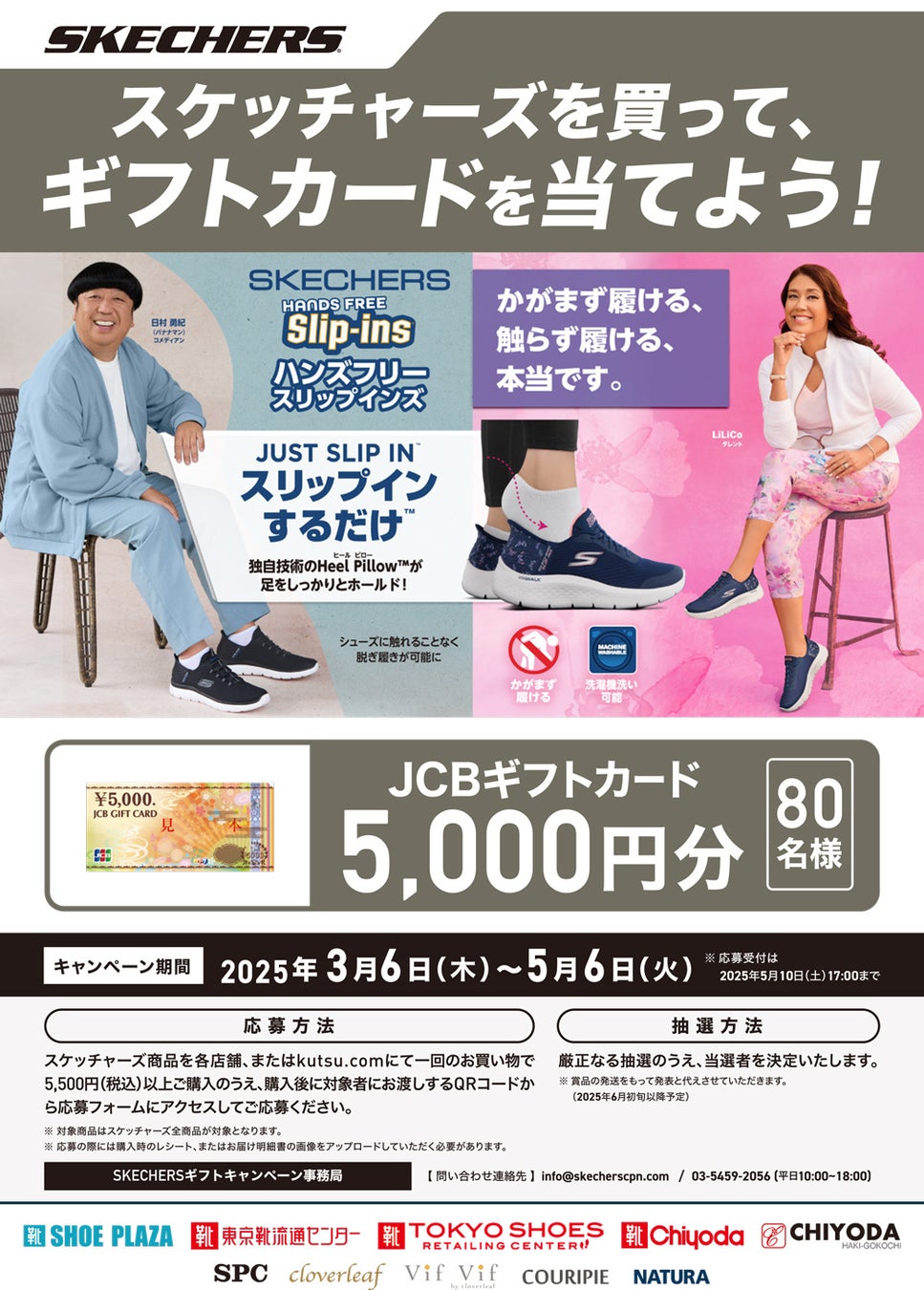 スケッチャーズ商品ご購入で「JCBギフトカード」が80名様に当たる!全国のシュープラザ、東京靴流通センター他各店舗と、公式オンラインショップで、3月6日よりプレゼントキャンペーン開催。