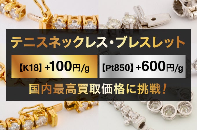 昨年開催し、大変ご好評いただきました喜平ネックレスのキャンペーンをそのまま転用し、テニスネックレス/ブレスレットでも、その貴金属価格を相場を超えてお買取りさせていただきます。もちろんセットされたダイヤモンドは別査定にてお値段を上乗せいたします。