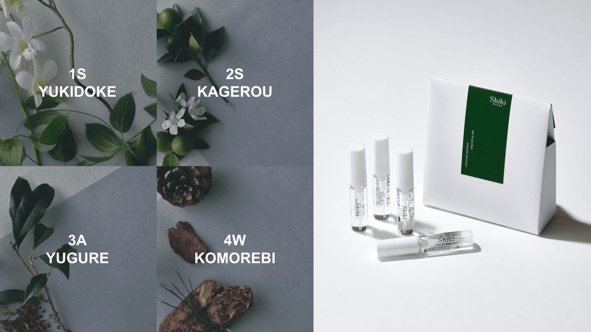 YUKIDOKE、KAGEROU、YUGURE、KOMOREBIの春夏秋冬それぞれの香りを少量でお試しいただけるオードパルファムのミニセットです。
