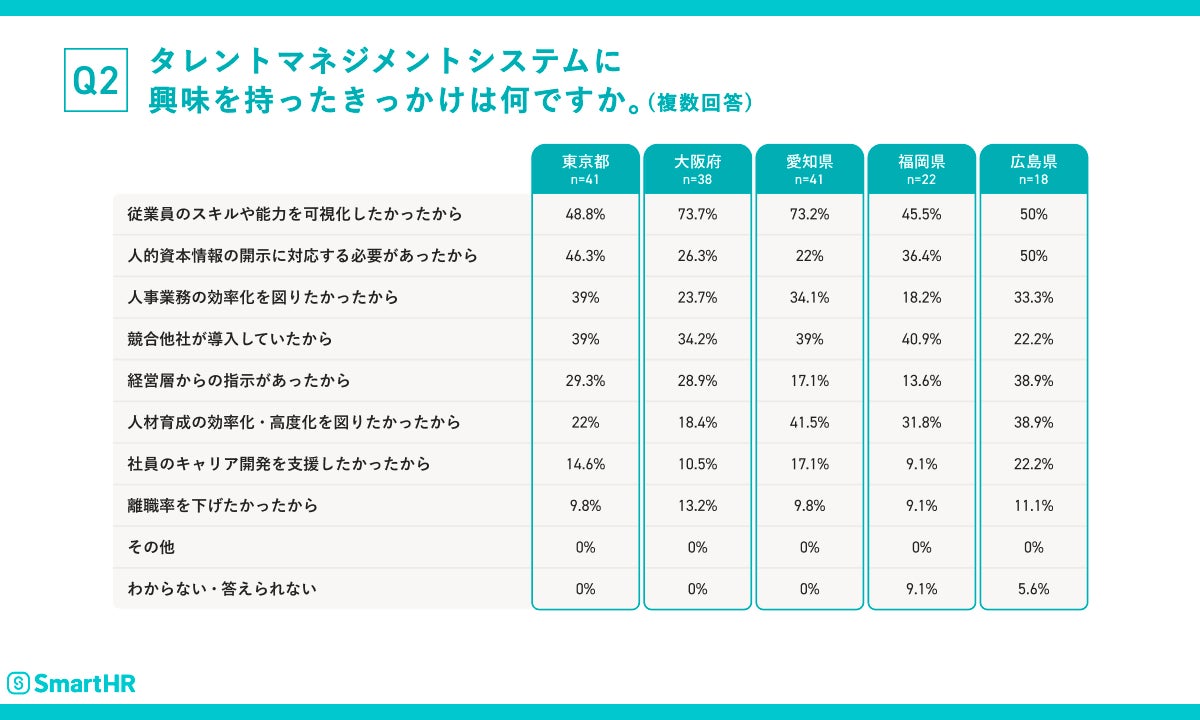タレントマネジメントシステムを導入している、または導入を検討している担当者を対象に「タレントマネジメントシステムに興味を持ったきっかけは何ですか。(複数回答)」と質問したところ、東京都・大阪府・愛知県・福岡県・広島県の全地域で「従業員のスキルや能力を可視化したかったから」が最多の結果になりました。なかでも大阪府と愛知県は約7割が同項目を選択しており、スキル情報の一元管理に対する関心の強さが際立っています。