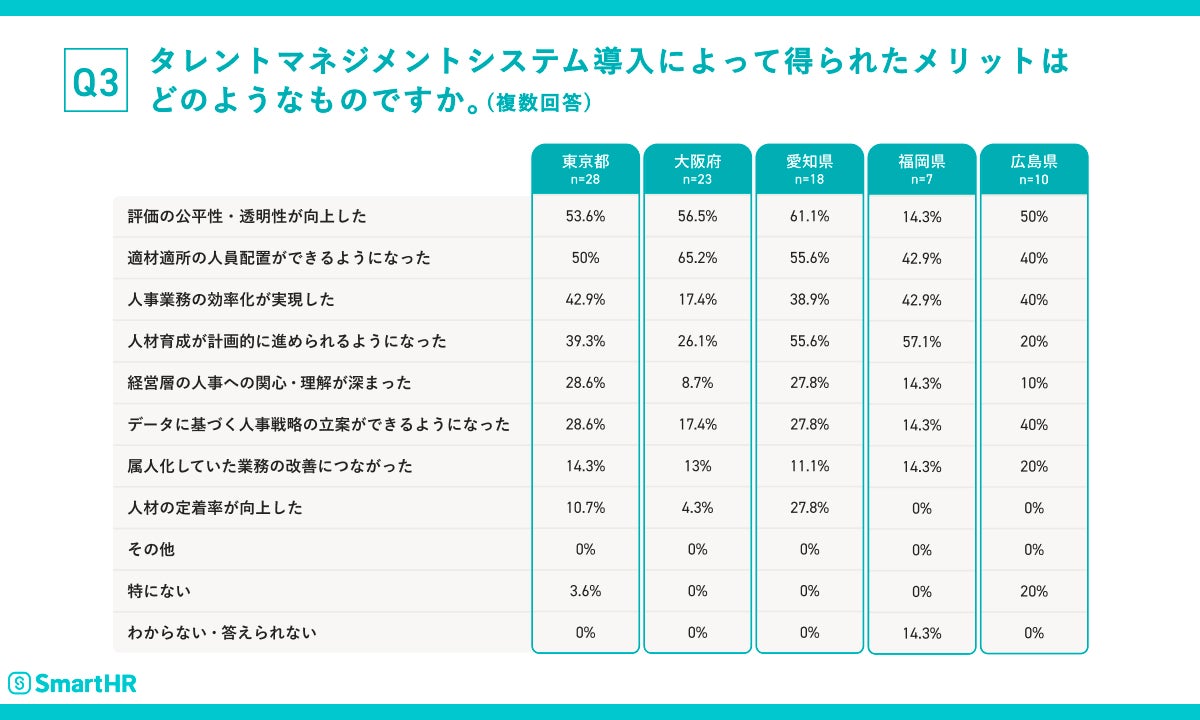 また、タレントマネジメントシステム導入によるメリットでは、地域によって異なる傾向が見られました。東京都・愛知県・広島県は「評価の公平性・透明性が向上した」が最多となったほか、大阪府は「適材適所の人員配置ができるようになった」、福岡県は「人材育成が計画的に進められるようになった」が最多になっています。また、愛知県では他エリアと比較して「人材の定着率が向上した」という効果を実感している企業が多く、製造業が集積する地域ならではの人材の定着に関する課題も見られました。