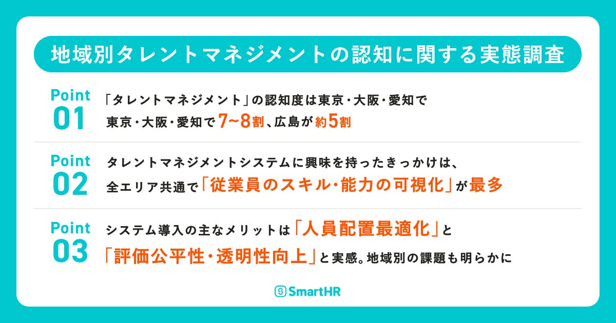 クラウド人事労務ソフト「SmartHR」を運営する株式会社SmartHR(本社:東京都港区、代表取締役CEO:芹澤 雅人)は、タレントマネジメントシステムを導入、または導入を検討している企業の人事労務・労務担当者160名を対象に、地域別の“タレントマネジメント”に対する認知度およびシステム導入の実態について調査を行いました。