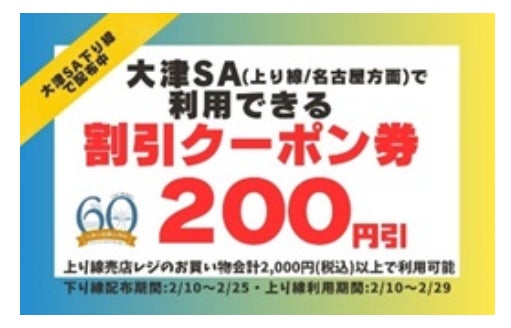 60周年を記念して下り線のショッピングコーナーを利用された方全員に、上り線のショッピングコーナーで2,000円以上購入時にご利用いただける「200円割引クーポン券」を進呈いたします。